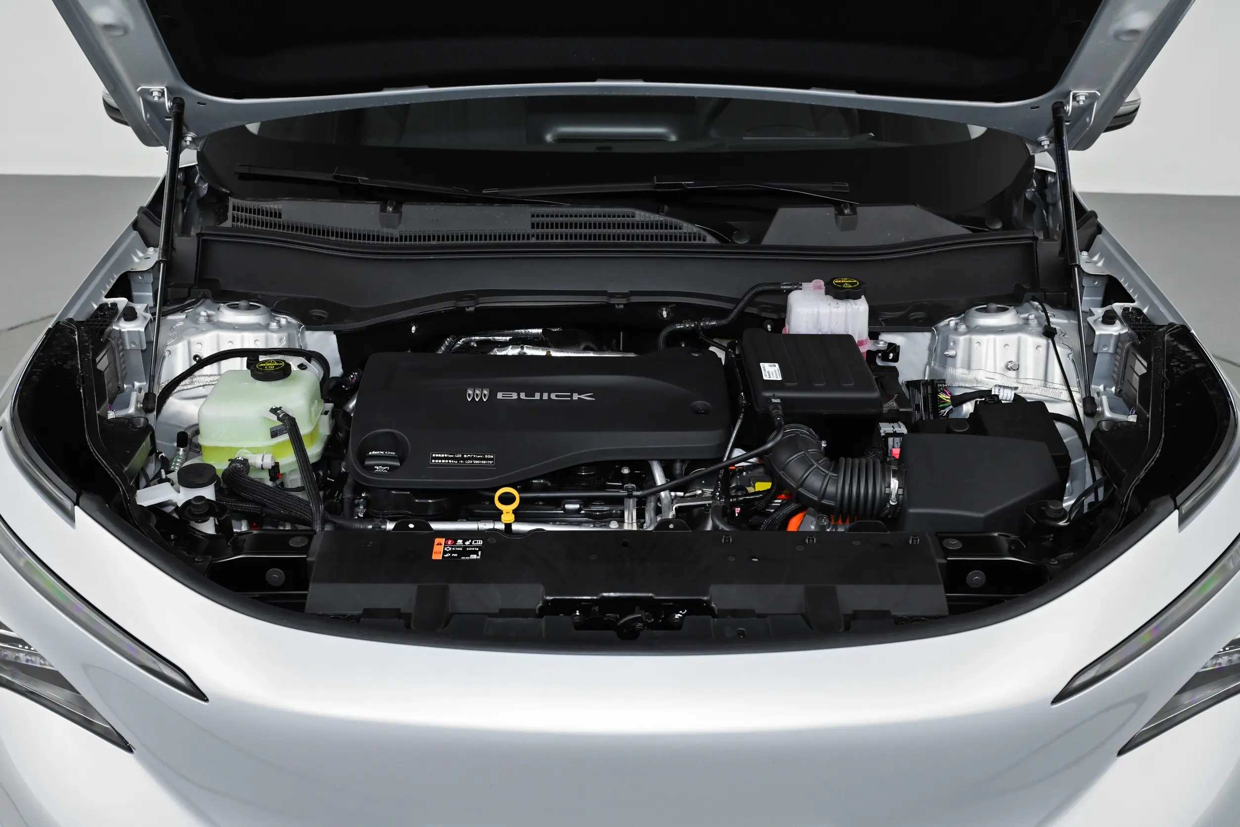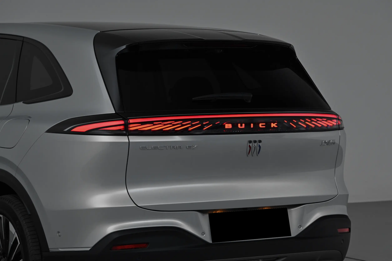 视角转至车尾,后风挡玻璃向前倾斜,车顶探出黑色扰流板,尾厢上沿稍稍凸起,镶嵌贯穿式尾灯组,内部光源像是张开的羽翼,中间还有发光的别克字母车标。尾门中部向内凹陷,后包围采用不规则黑色装饰,底部覆盖枪灰色扩散器护板,为时尚设计画下句号。