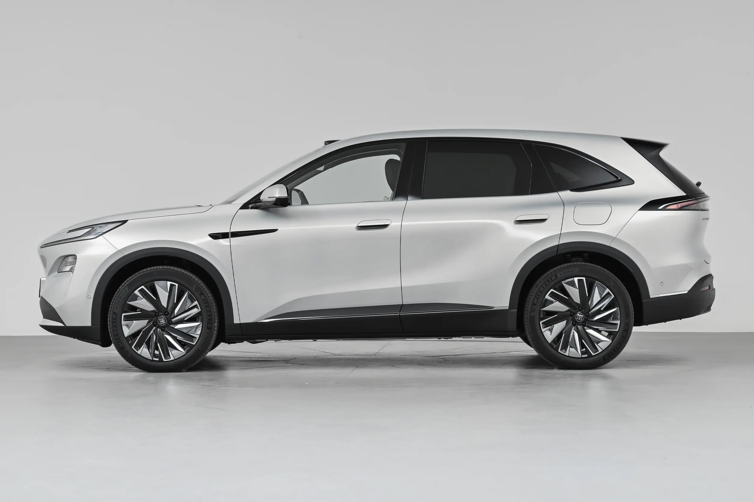 外观方面,至境E7采用全新的设计语言,前脸部分为封闭造型,车鼻略微凸出,两侧头灯组采用分体式布局,上部日行灯呈“C”字形,下部远近光大灯较为小巧,并且有着弯折的倒角,下包围梯形通风口承担散热作用,搭载主动式格栅系统。车顶激光雷达成为核心特征,搭载“逍遥智行”辅助驾驶系统,基于Momenta R6大模型,支持高速、城区全场景辅助驾驶和全场景泊车。
