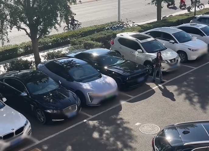 最后出现的阿维塔06采取了不同的解决方案:车主下车后,通过手机操作启动了车辆的智能泊车功能。在无人操控的情况下,车辆自行完成了泊入动作,并保持了与两侧车辆的安全距离,成功停入。